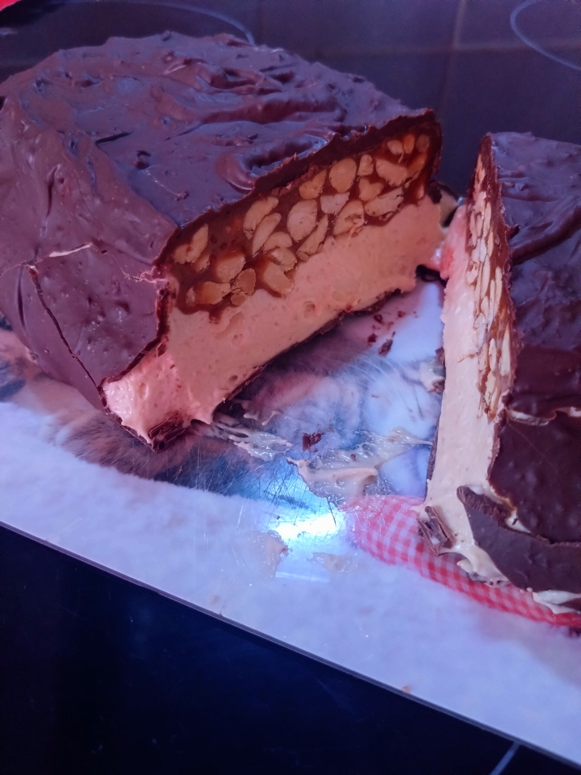 • Schoko-Crossies Torte: Biskuitböden (im Teig sind Schoko Crossies) gefüllt mit Schokoladensahne und Crunch